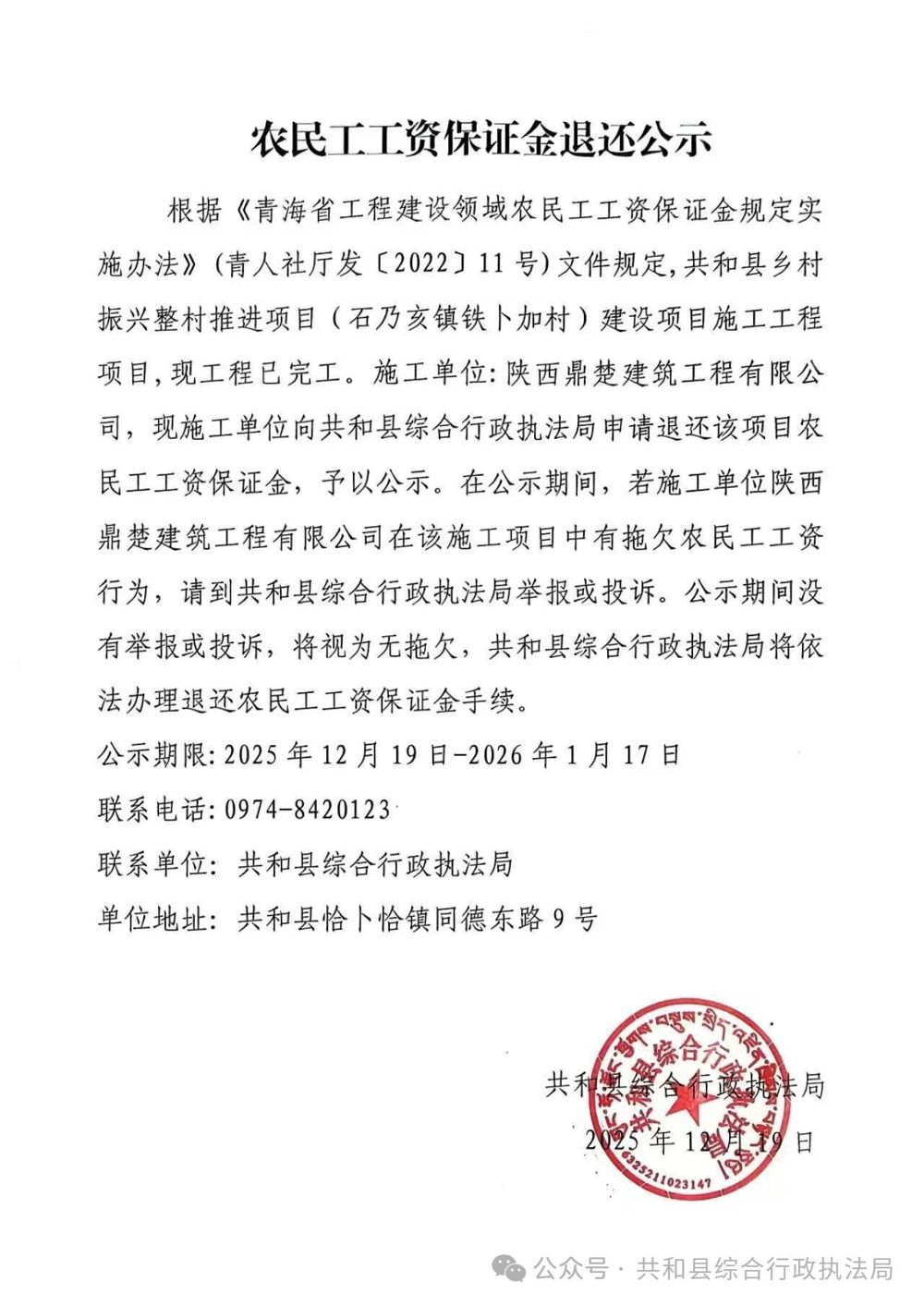 索引号: 3070211020000043000000/2025121900000553 发布机构: 生效日期: 2025-12-19 废止日期: 文 号: 所属主题: 民生信息、重点领域(农牧、财政、民政、卫生、食品、住房、教育、体育文化、乡村、) 农民工工资保证金退还公示 来源: 发布时间:2025-12-19 浏览次数: 次 【字体:小 大】 【打印正文】 分享到: 【字体:小 大】