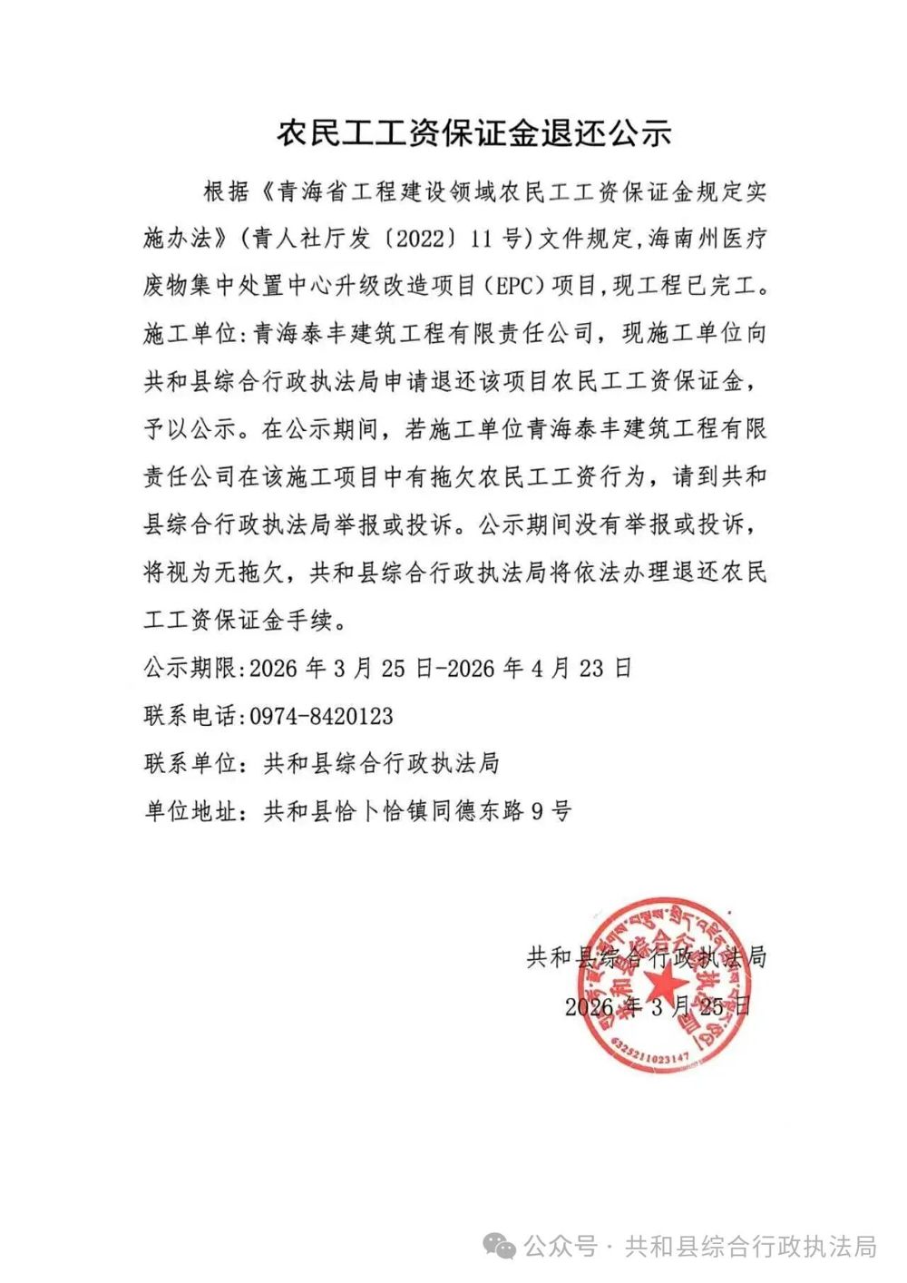 索引号: 3070211020000043000000/2026032500000193 发布机构: 生效日期: 2026-03-25 废止日期: 文 号: 所属主题: 民生信息、重点领域(农牧、财政、民政、卫生、食品、住房、教育、体育文化、乡村、) 农民工工资保证金退还公示 来源: 发布时间:2026-03-25 浏览次数: 次 【字体:小 大】 【打印正文】 分享到: 【字体:小 大】
